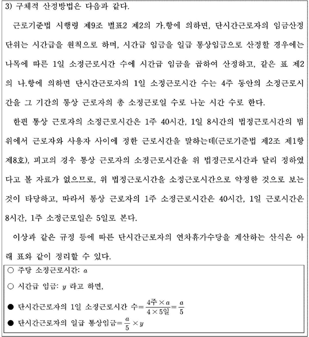 ④ 또한 ‘소정근로시간’은 ‘실제 근로시간’과 반드시 일치하여야 하는 개념이 아니다. 근로기준법 역시 연차휴가수당과 주휴수당 지급 대상을 ‘1주 동안의 실제 근로시간이 15시간 이상인 근로자’가 아니라 ‘1주 동안의 소정근로시간이 15시간 이상인 근로자’로 규정하고 있다. 즉 근로기준법은 연차휴가수당 및 주휴수당 지급 대상을 일정한 수준 이상의 근로를 제공하는 근로자로 한정하면서도, 그 기준을 일정한 수준 이상의 근로를 실제로 제공한 근로자가 아니라 ‘당사자 사이에 일정한 수준 이상의 근로를 제공하기로 약정한 근로자’로 규정하고 있는 것이다.