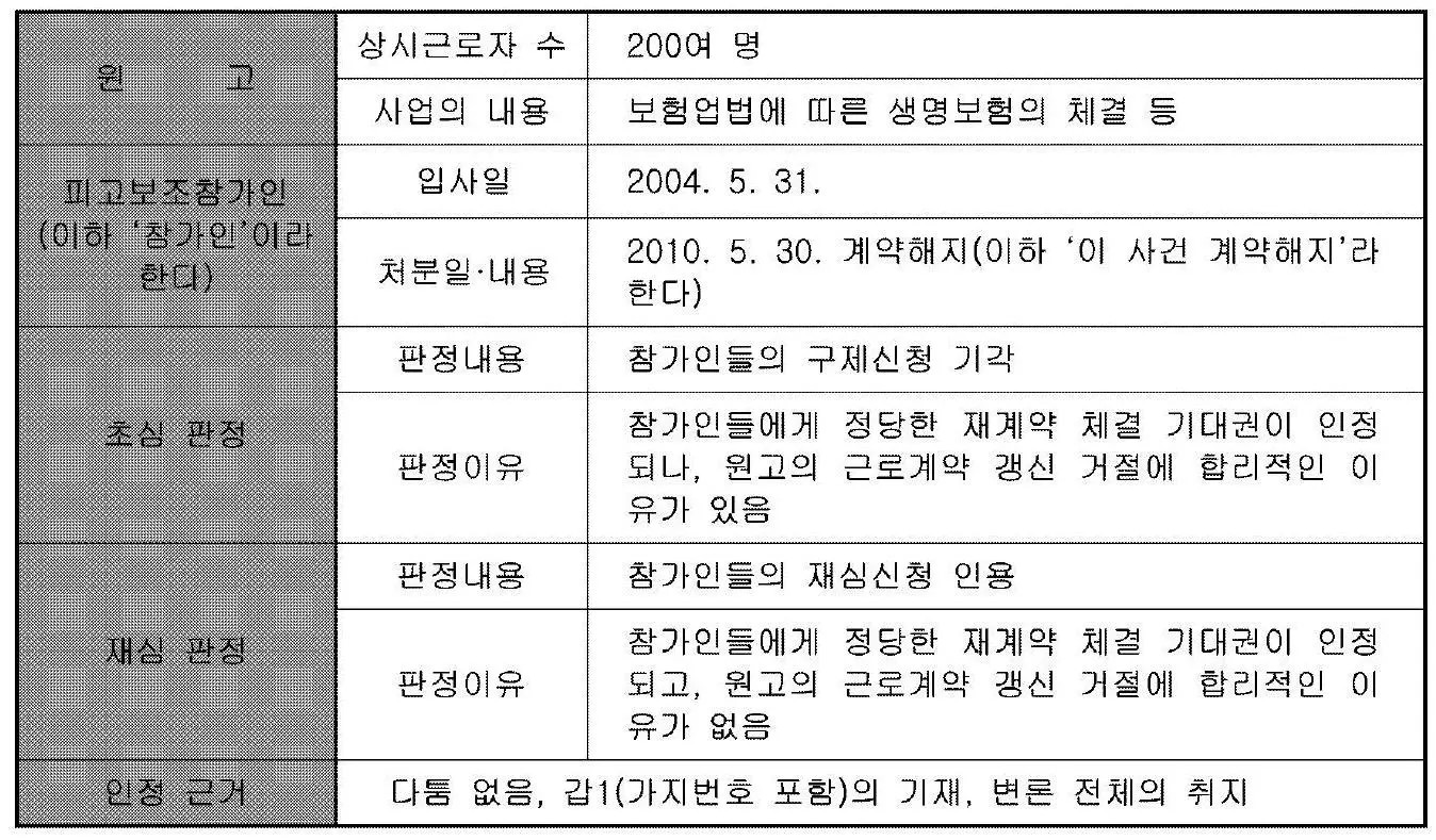 원고와 참가인들의 근로관계는 근로계약에서 정한 계약기간의 만료로 종료하였고, 단지 근로계약이 반복 체결되었다는 사정만으로 참가인들에게 재계약 체결에 관한 정당한 기대권이 존재한다고 인정할 수는 없다.